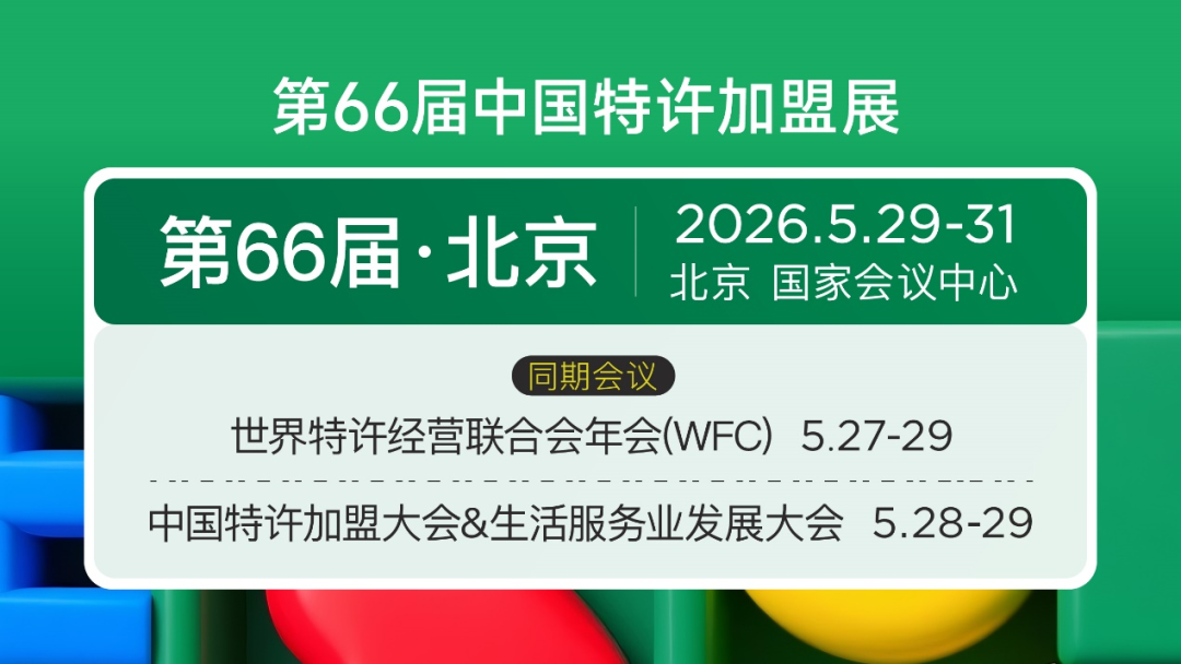 在此经济向新、消费向优的背景下,第66届中国特许加盟展将于2026年5月29—31日在北京国家会议中心盛大举办。本届展会规模超30000㎡,将汇聚300+优秀特许品牌,为来自全国各地的加盟投资人开启合作新窗口,助力品牌事半功倍拓展市场新版图。